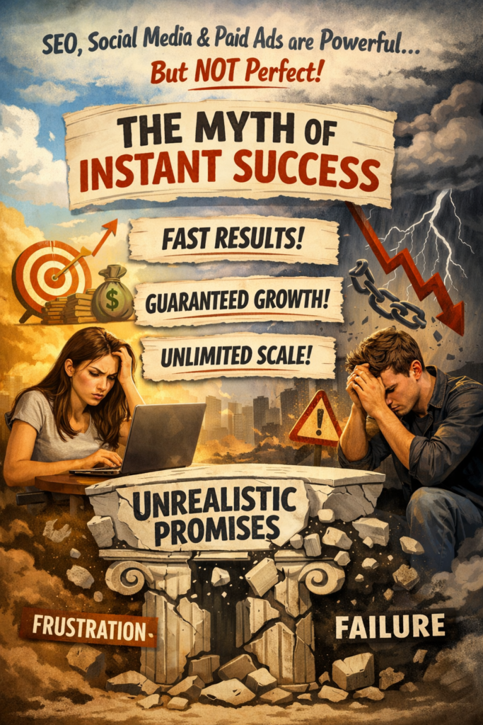 SEO, social media, and paid advertising are powerful — but they are not perfect. Beginners are often sold an unrealistic version of digital marketing where results are fast, guaranteed, and scalable forever. This mindset causes frustration and failure.